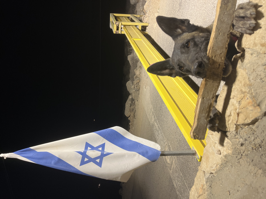 This nighttime image captures a scene described as being in the city of Unknown, Palestinian Territory. In the upper left quadrant, an Israeli flag, featuring a blue Star of David centered between two horizontal blue stripes on a white field, hangs vertically from a slender metal flagpole. The flag appears slightly creased. To the right of the flagpole, a bright yellow structure, possibly a barrier, ramp, or gate arm, extends diagonally into the midground. This structure has a perforated surface and is supported by a vertical yellow post at its far right end. The background consists of a dark night sky with minimal discernible features, and below it, an uneven, rocky terrain. In the foreground, a low wall constructed from irregular, light-colored stones spans the bottom of the frame. A dark-furred dog, resembling a German Shepherd or Belgian Malinois, is positioned behind this stone wall. Its head and front paws are visible above the wall, with the dog holding a light-colored wooden stick horizontally in its mouth. Its front paws are resting on the top edge of the stone wall. The scene is illuminated by an unseen artificial light source, casting shadows and highlighting the flag, the yellow structure, and the dog against the darkness. No human figures are present.