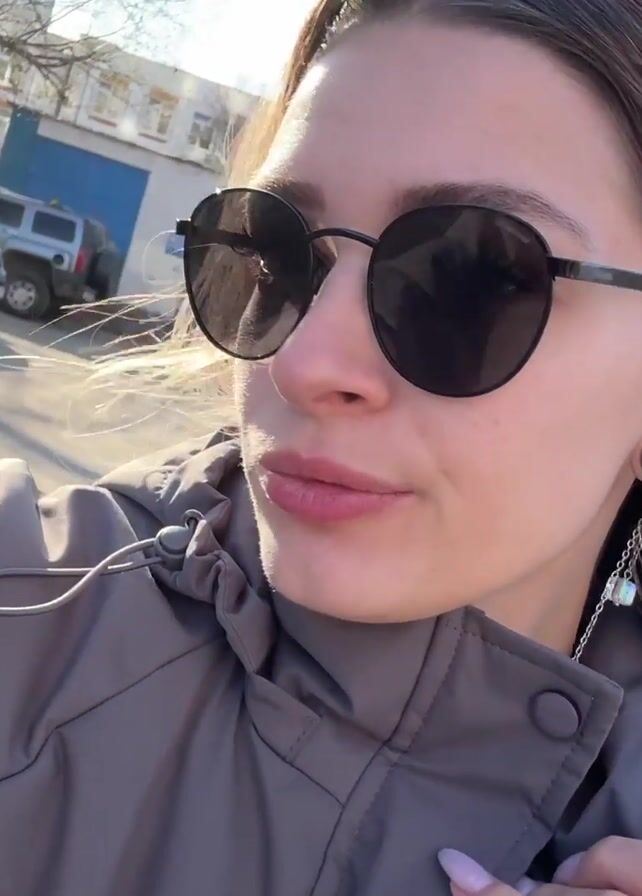 woman wearing sunglasses, a gray jacket, and earrings, standing in a parking lot on a sunny day. She is recording a video, saying good morning. Cars are visible in the background.