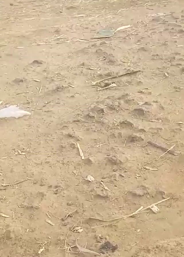 dirt yard with a goat eating in the background. The yard is littered with debris, including pieces of straw, sticks, and plastic. A building made of corrugated metal and concrete forms the backdrop. The goat is light-colored.