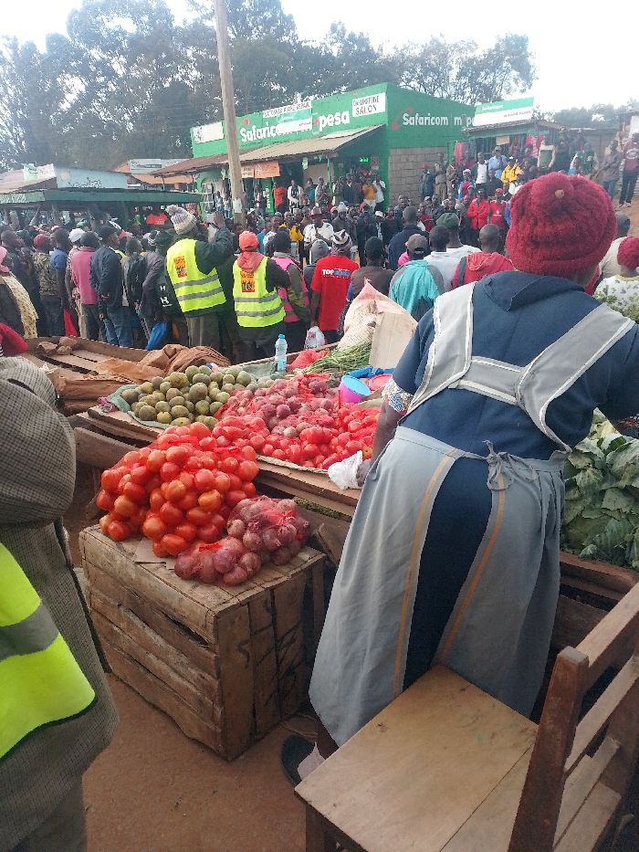The image depicts a busy outdoor market scene in Chevaywa ward, Kenya