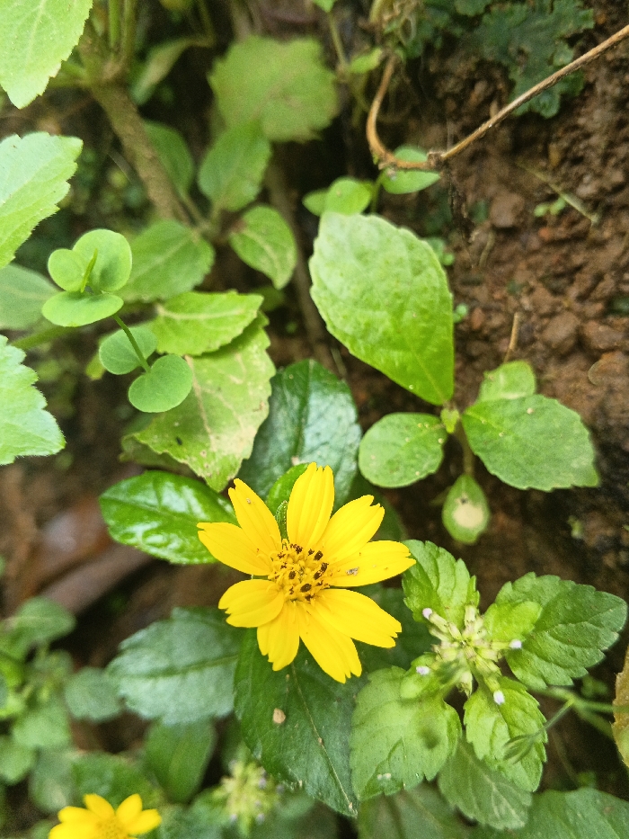 A vibrant yellow flower with a dark brown center is the focal point, nestled among an assortment of green foliage. Various leaf shapes and textures surround the bloom, from small, rounded leaves to larger, more textured ones. The background consists of soil and other green plants, creating a natural and organic scene.