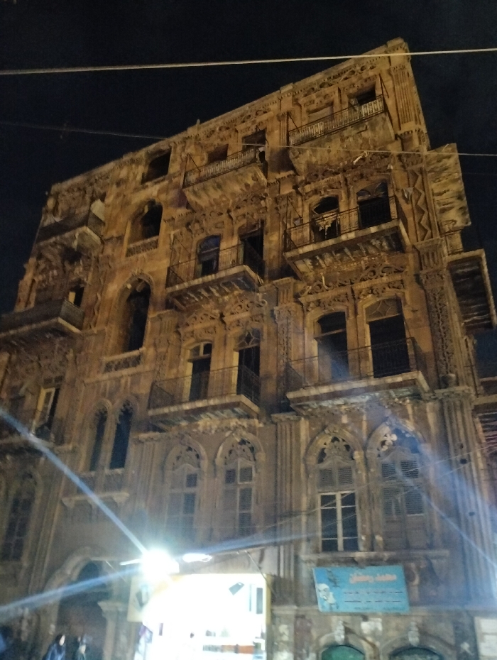 A low-angle, nighttime shot captures an old, ornate building. The structure features intricate architectural details, including arched windows, balconies, and decorative moldings. The building appears aged and weathered, with some areas showing signs of disrepair. A street light casts a bright glow, illuminating the lower portion of the building and creating harsh shadows. A blue sign is affixed near the entrance. The sky is dark.