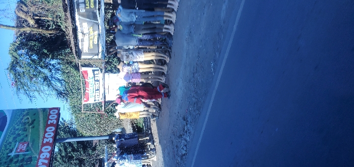 Clothes line a roadside display, vibrant in hues of yellow, red, teal, purple, and neutral tones. A street runs alongside the collection. Signs featuring phone numbers and promotions are present, contrasting with a leafy tree in the background and blue sky overhead.