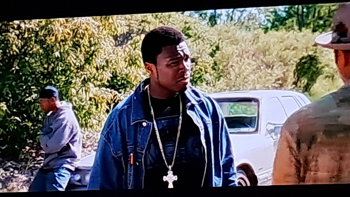 Three men are outside. A younger Black man in a denim jacket and large cross necklace stands in the foreground, looking to the right. An older man with a hat is partially visible on the right. A third man, wearing a gray hoodie and a black baseball cap, leans on the trunk of a white car in the background. Trees and greenery are visible behind the subjects.