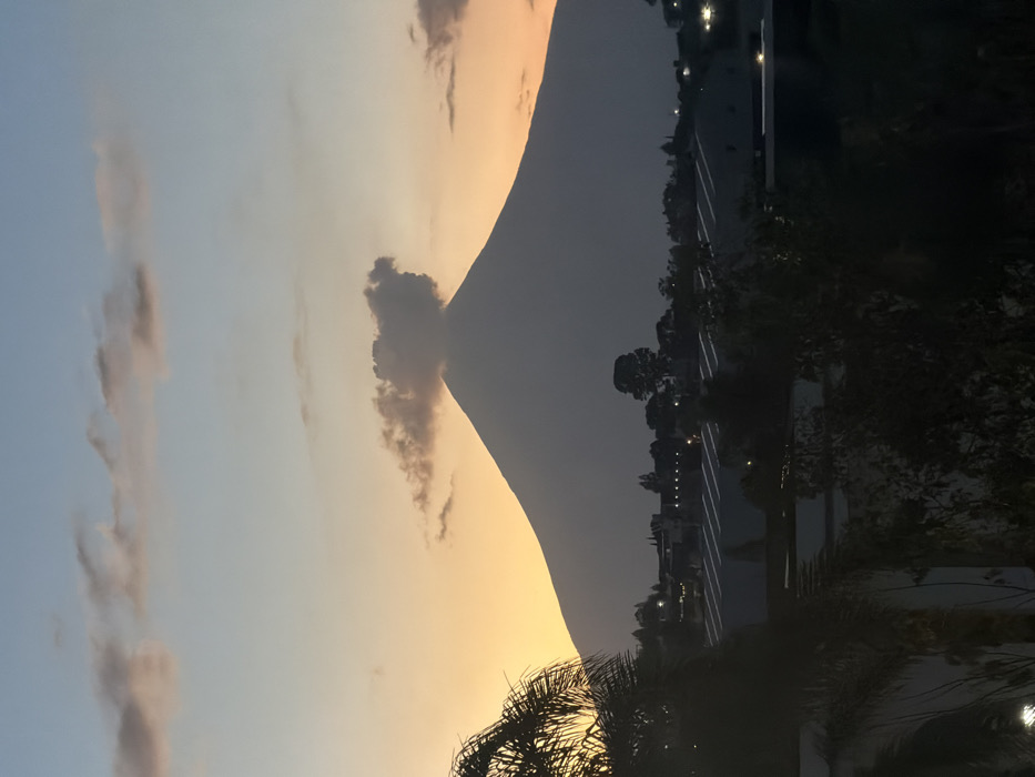 A silhouette of a mountain against a sunset sky is captured. The sky transitions from blue to orange, with scattered clouds. A prominent cloud appears near the mountain's peak. A tree sits in the foreground. Along the mountain's base, streetlights dot the landscape. Buildings and a road are visible, partially obscured by greenery.