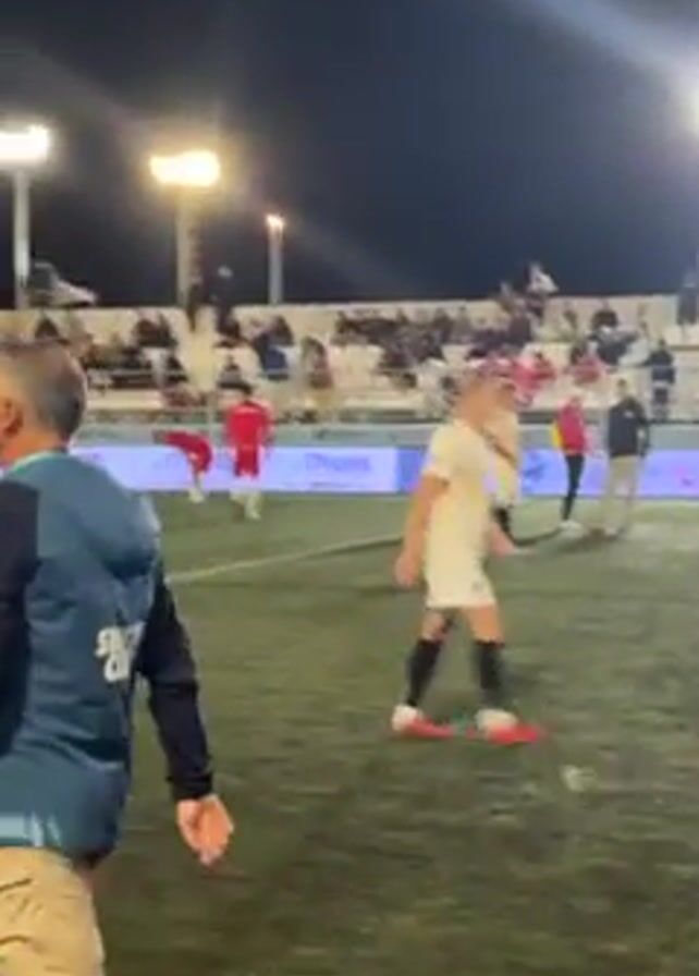 soccer match being played at night under bright floodlights. The game is being watched by a crowd seated in stands that run along the side of the field. Men in uniform can be seen walking along the side of the field and watching the match. The players are wearing either red or white/tan colored jerseys. A temporary structure with a tent can be seen in the background.