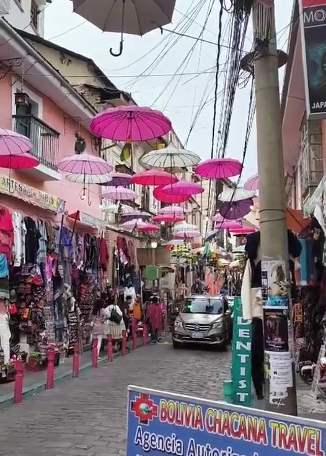street scene in a town decorated with colorful umbrellas suspended overhead. The street is paved with cobblestones and lined with buildings, many of which are painted pink or other light colors. Shops selling clothing, souvenirs, and other goods line the street. Several people are walking along the street, browsing the shops. A car is parked in the middle of the street, and another car is visible in the distance. Power lines and other wires are strung across the sky, above the umbrellas. A sign for "Bolivia Chacana Travel" is visible in the foreground.
