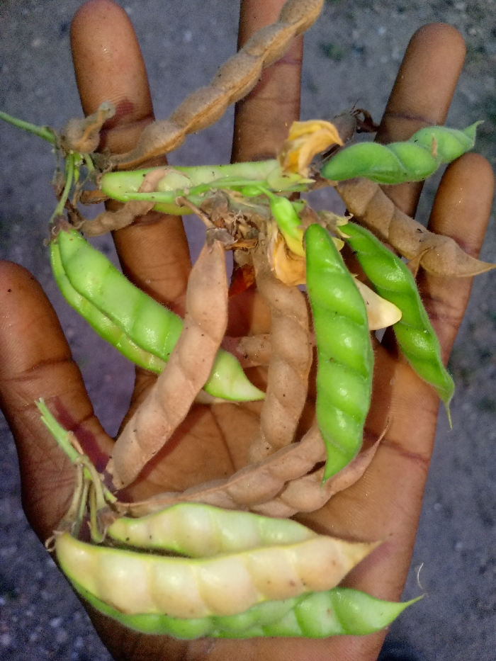 A dark-skinned human hand is depicted holding a collection of approximately a dozen plant pods. The pods vary in maturity; several are vibrant green, plump, and intact, with one visible pod partially split to reveal pale internal seeds. Interspersed among these are numerous dried, light brown, twisted pods. The hand, visible from the palm and fingers, occupies the majority of the foreground against a blurred, grayish background. This scene is situated in Adankolo, Nigeria.