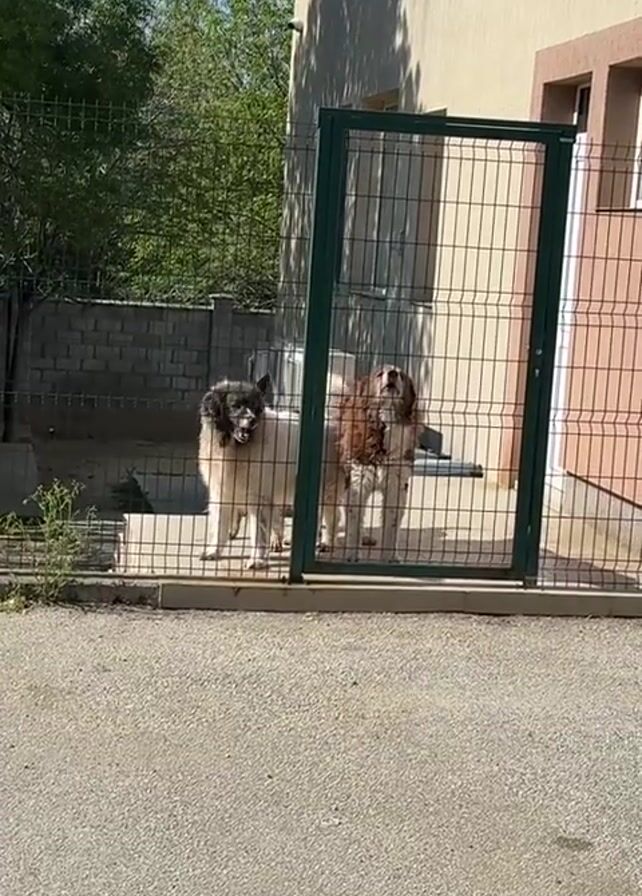two large dogs standing behind a metal fence. The dog on the left has white and black fur. The dog on the right has white and brown fur. They are both barking. The fence is green and surrounds a building. There is a gravel road in front of the fence. There is a tree and a brick wall visible behind the fence. The sky is blue and the sun is shining.
