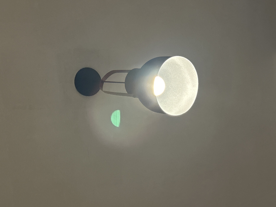 A wall-mounted lamp shines brightly in a dimly lit room. The lamp has a rounded shade and a visible bulb emitting a strong light. The lamp's arm extends from a circular base attached to the wall. A green, semi-circular reflection appears on the wall below the lamp, possibly indicating a colored lens or filter within the light fixture. The overall tone of the image is muted, with the bright lamp contrasting against the darker wall.