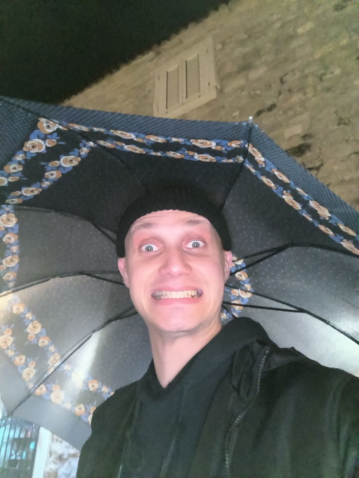 A person with wide eyes and a strained smile is under an umbrella decorated with small floral patterns. The person wears a black beanie and a black hoodie. The background includes a dimly lit stone wall with a small, boarded-up window. The lighting suggests it is nighttime. The composition is a close-up selfie, capturing the person's facial expression and the umbrella's design.