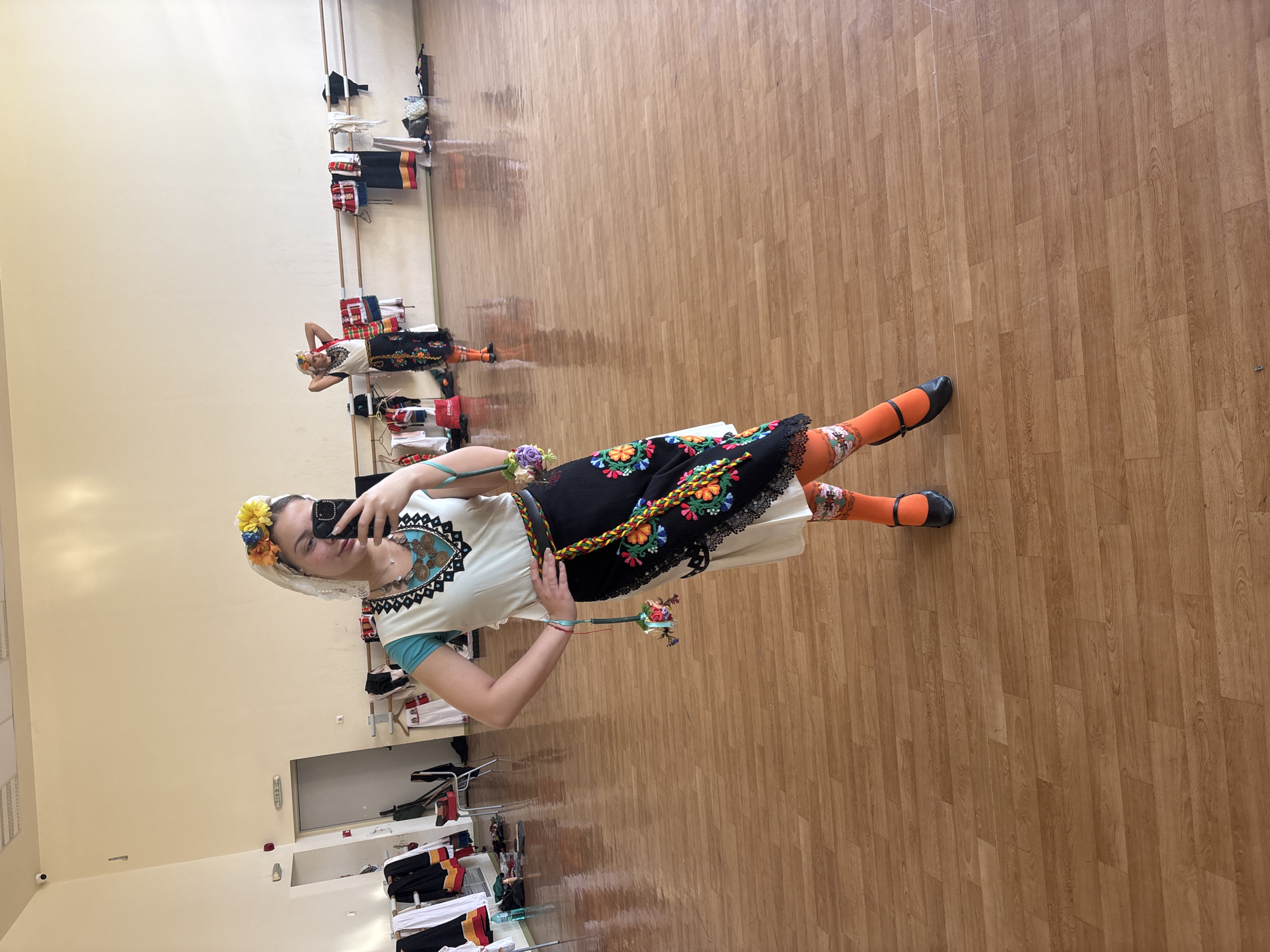 A young woman is standing in a dance studio, holding a smartphone to take a picture of herself. She is wearing traditional Bulgarian folk attire: a white embroidered shirt, a black skirt adorned with colorful floral embroidery and black lace, bright orange stockings with patterned detailing, and black shoes. A colorful, braided belt cinches her waist, and she wears a flower-decorated headpiece. In the background, other traditional costumes hang on racks and lay on the floor. The studio has light-colored walls and a wooden floor. Based on the presence of traditional Bulgarian folk costumes, this scene is likely taking place in a cultural center or dance studio within the city of Sofia, Bulgaria. Another person wearing similar clothing is visible in the background.