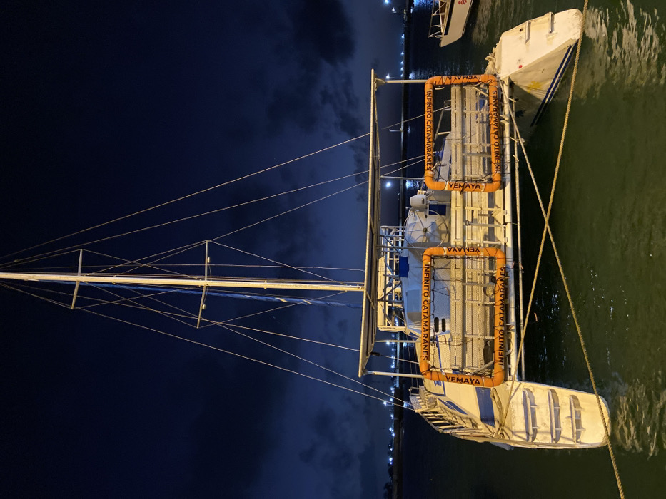 A white and blue catamaran is observed moored at night in Punta de Piedras, Venezuela. The vessel features a tall, slender mast with extensive rigging rising against a dark, cloudy night sky. Artificial illumination highlights the catamaran's mast, deck, and hull, casting reflections on the dark water. The stern of the catamaran displays two prominent orange, rectangular frames, each labeled "YEMAYA" vertically and "INFINITO CATAMARANES" horizontally, likely containing life rafts or similar safety equipment. Mooring lines are visible in the foreground, securing the vessel. Steps are integrated into the aft section of each hull. A partial view of another white boat is visible to the right of the catamaran, and distant lights from a city or harbor area are discernible along the horizon. No individuals are present in the frame.