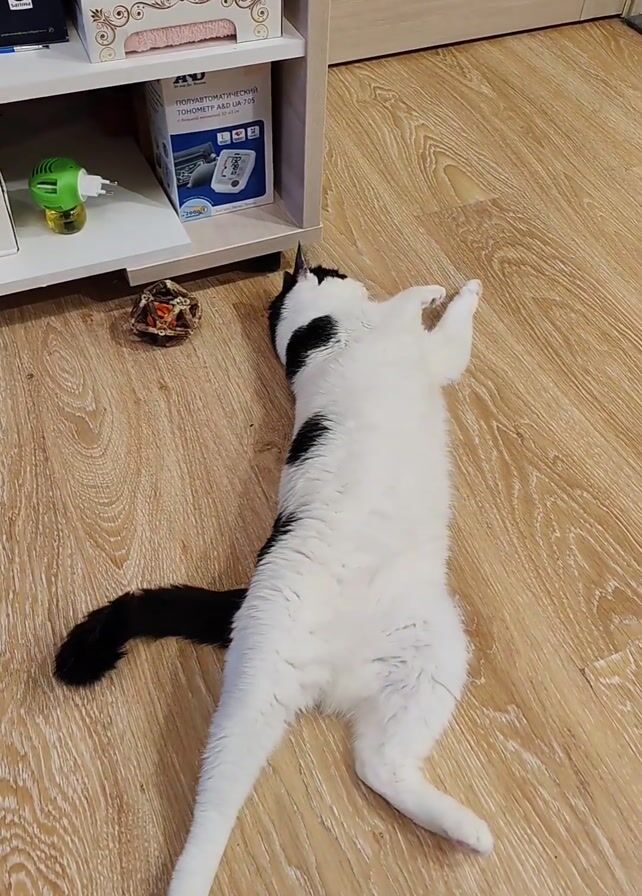 A cat with white fur and black markings is lying on its back on a wooden floor. It is near a white shelf unit. Its tail is black. The cat’s paws are lifted up, as if it is stretching. There is a small brown ball-shaped object near the shelf unit.