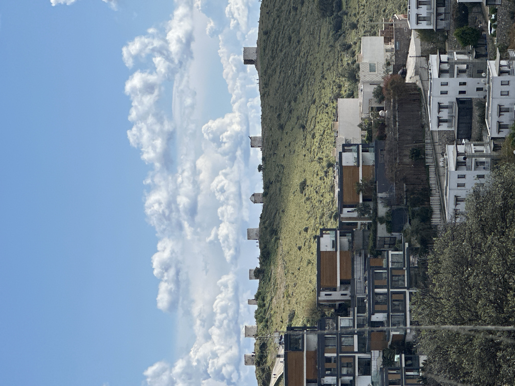 The image presents a view of a hillside development in Bodrum, Turkey. The hillside is densely covered with green vegetation and features a series of stone towers or fortifications running along its crest. Adjacent to the hillside, there is a collection of modern residential buildings. These structures exhibit contemporary architectural designs, characterized by box-like structures with multiple windows and balconies. The buildings are constructed with a combination of materials, including glass, wood, and concrete. The sky is predominantly blue, with scattered white clouds.