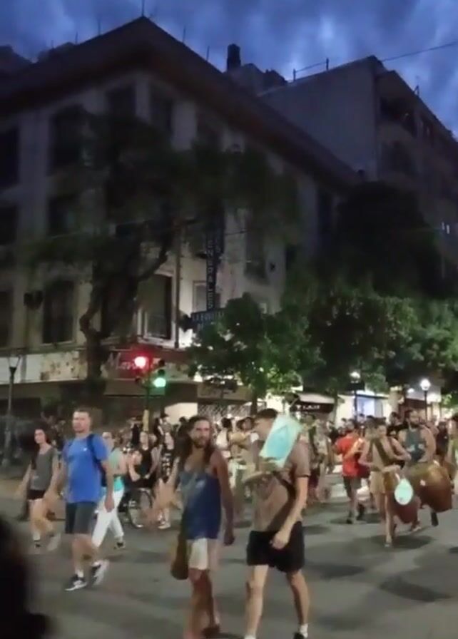 A small crowd parades down a city street at dusk. The group is diverse, with individuals of varying ages and ethnicities. Some are playing drums, while others carry signs or simply walk alongside. The buildings lining the street are tall and appear old, illuminated by streetlights and the dim glow of dusk. The sky overhead is dark with cloud cover. The general atmosphere is one of celebration or protest.