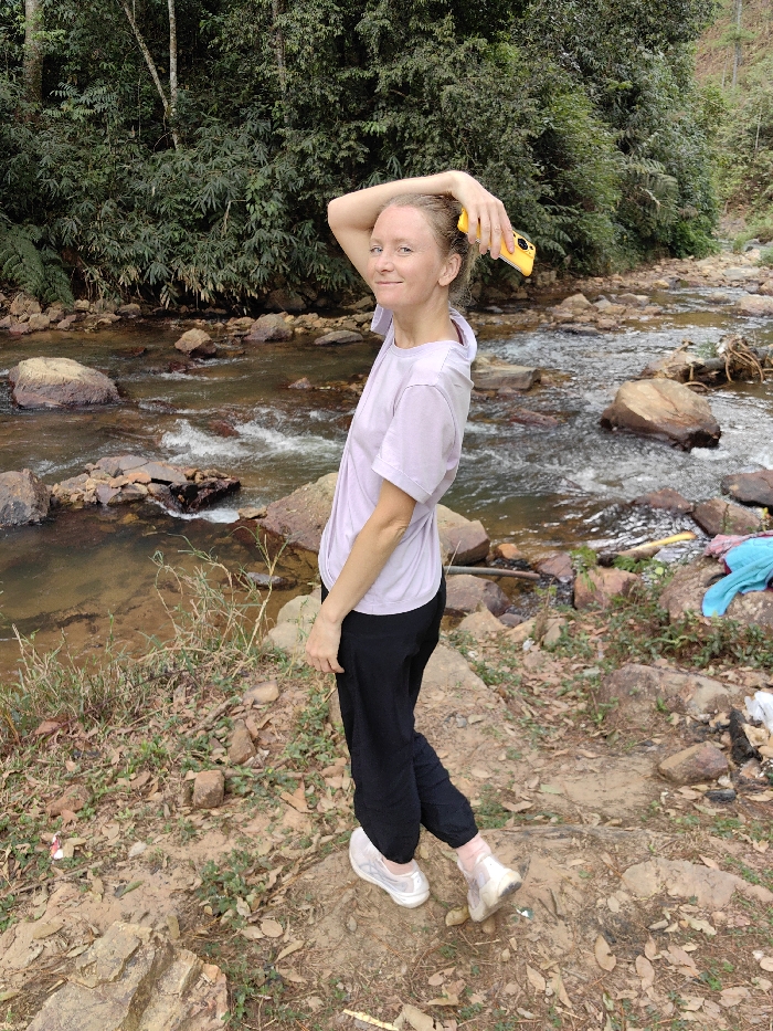 A blonde woman poses near a river. She wears a light purple t-shirt, black pants, and white sneakers with pink socks. A yellow phone rests on her head. The river flows over rocks with lush green vegetation in the background. The ground is covered in brown dirt and some scattered foliage. A blue garment lies crumpled near the riverbank.
