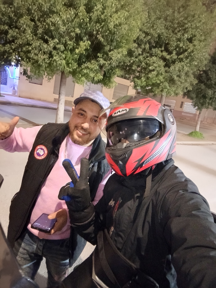 Two men are posing for a photo at night. One man wears a light pink sweater, dark vest with a Canada Goose patch, jeans, and a patterned hat, giving a thumbs-up and holding a phone. The other man wears a black jacket and a red and black motorcycle helmet, giving a peace sign with a gloved hand. The setting appears to be a street with trees and lit buildings in the background.