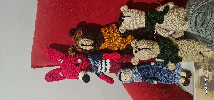 A red pillow is arranged with an assortment of crocheted dolls and craft materials. Four teddy bears in tan, brown, and beige hues are present, some adorned with scarves. A red reindeer doll and a blue-clothed doll also appear. Adjacent to the dolls are gray yarn and a book containing a black-and-white photograph of people.