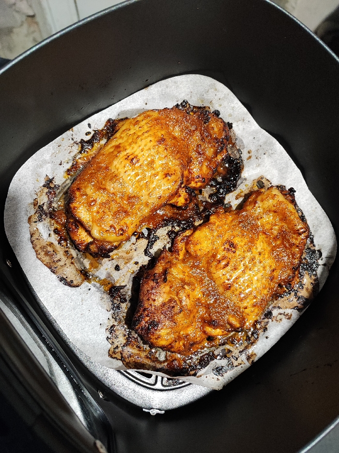 - "The image displays two pieces of cooked poultry, identified as chicken, resting on a sheet of crumpled parchment paper within the black interior of an air fryer basket" by FM-7CnuG3, licensed under CC BY 4.0