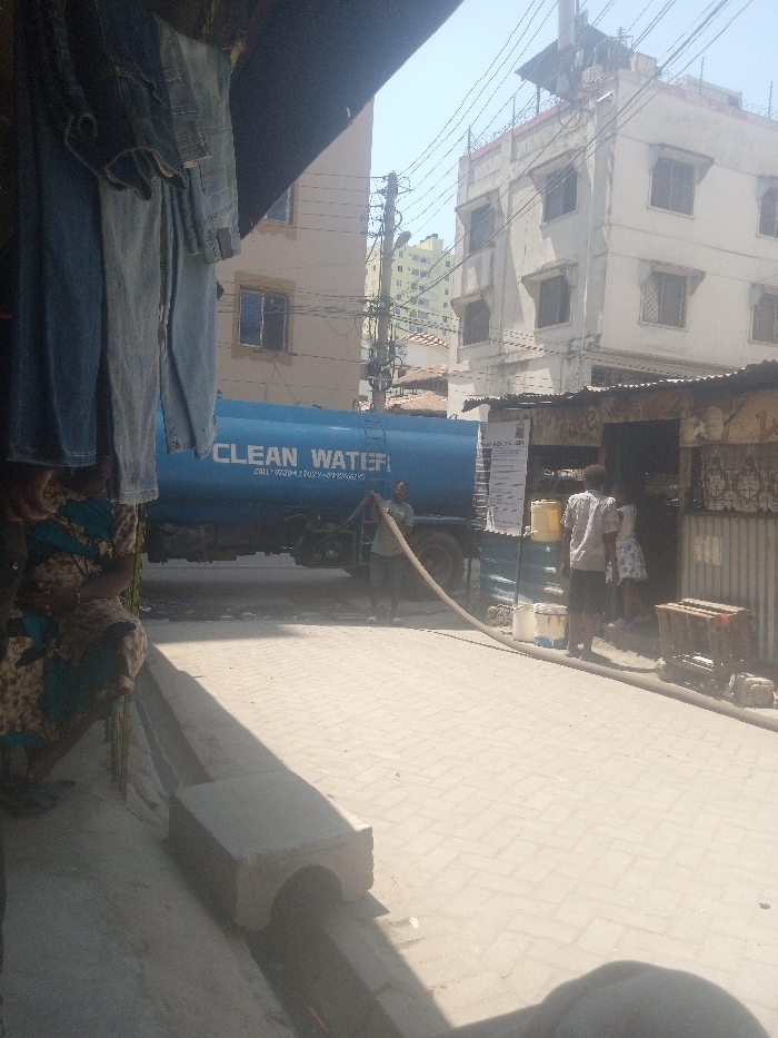 This image depicts a daytime street scene in Tudor ward, Kenya, characterized by urban infrastructure and activity. In the immediate foreground on the left, several items of blue and light blue denim clothing hang from an unseen structure, partially obscuring a seated individual wearing a patterned blue and brown dress. The ground consists of light-colored interlocking pavers, with a concrete drainage channel running along the bottom left, partially covered by a precast concrete section. Centered in the midground is a large, blue tanker truck marked with white text "CLEAN WATER" and two phone numbers: "CALL: 0720427079 - 071249210". A male individual, dressed in a light-colored shirt and dark shorts, stands beside the truck, actively managing a large, coiled beige hose extending from the tanker. To the right of the tanker, a small commercial structure with corrugated metal walls is visible, displaying a white informational poster. In front of this structure, a male individual in a light shirt and dark shorts stands with his back to the viewer, facing a female in a white patterned dress and a smaller individual, all appearing to be near the shop's entrance. Several white buckets and a yellow jerry can are positioned on the ground near the shop. A wooden crate or pallet rests on the ground to the far right. The background features several multi-story buildings. Directly behind the tanker, a beige-colored building with multiple windows is visible. To its right, a taller, white, five-story building with numerous dark-framed windows and a flat roof with utility structures is present. Further in the distance, a light green or yellow high-rise building can be seen. A dense network of overhead utility wires and poles traverses the clear, bright sky.