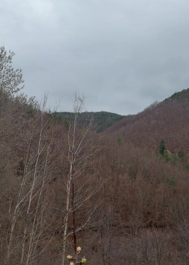 mountain landscape under an overcast sky. In the foreground, there are bare trees with a few buds beginning to sprout. Behind them is a densely wooded hillside, mostly brown with some patches of green from evergreen trees. The sky is a uniform gray, with no distinct features. The camera pans slightly to the left, revealing more of the trees in the foreground.