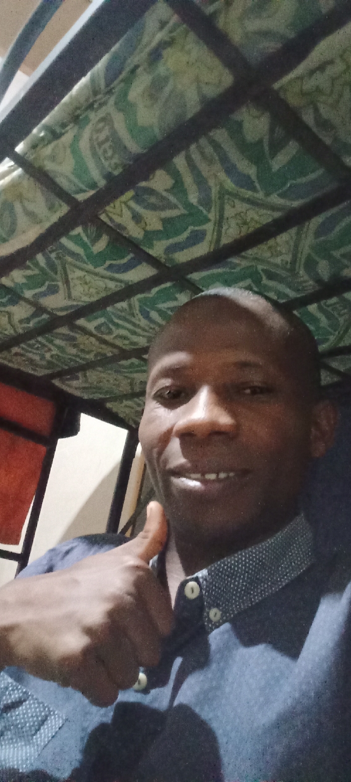 A dark-skinned man smiles while giving a thumbs-up. The man is bald and wears a dark blue button-down shirt with a patterned collar. Above him is a metal frame covered with a patterned fabric in green, blue, and white. An orange object is visible behind the man, near the frame's left side. The overall lighting is somewhat dim.