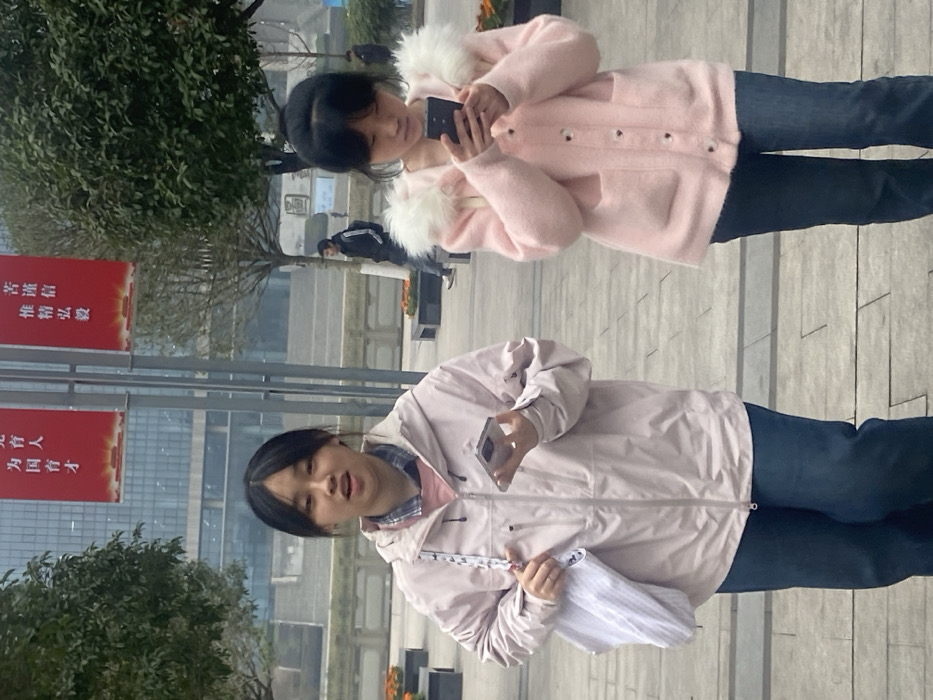 Two Asian women are standing outside. The woman in the foreground wears a light pink jacket and jeans, holding a phone in one hand and a striped bag in the other. The woman behind her wears a pink cardigan with fur trim and jeans, also holding a phone. They are standing on a paved area, with trees and signs visible in the background.