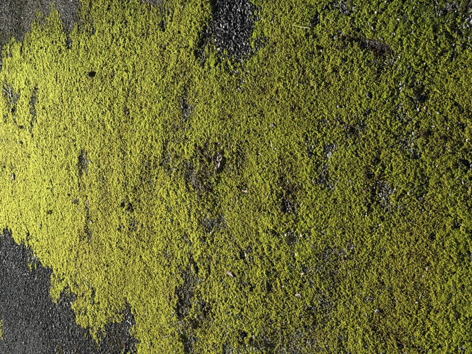 The scene, located in Ponlat-Taillebourg, France, depicts a close-up, downward-angled view of a ground surface. The primary subject is an extensive growth of vibrant green moss colonizing a dark, granular substrate, consistent with asphalt or compacted gravel. The moss forms a dense, low-lying mat across irregular patches of the ground. Sections of the darker substrate, composed of varied sized aggregates, are visible through and around the moss. No individuals, animals, or specific identifying objects are present. The environment is outdoor, illuminated by natural daylight which emphasizes the moss's texture and color saturation.