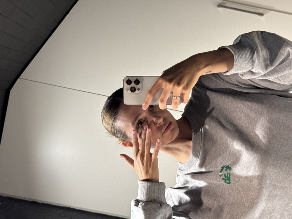 The image captures a female individual taking a mirror selfie indoors. The subject, with light brown hair pulled back, is wearing a grey crew-neck sweatshirt that displays a green, stylized logo on the left chest. Her left hand, adorned with light pink nail polish, is raised with fingers splayed across her left eye, partially obscuring it. Her right hand holds a light-colored smartphone, equipped with a triple camera system, in a vertical orientation, reflecting her image. A metallic ring is present on the ring finger of her right hand, and a small tattoo is visible on her right forearm. The background consists primarily of light-colored wall panels or doors. Dark, textured elements, resembling dark brick or tile, are visible in the upper left portion of the frame, while a dark, curved ceiling edge appears in the upper right. The specific location within Tbilisi, Georgia, is not discernible from the visual information provided.