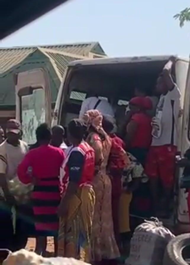 A video depicts a group of people clustered around the open back door of a white van. People are packed inside the van, while others stand outside. Some individuals are carrying large sacks of produce towards or from the van. There are also tires and what appear to be more produce sacks on the ground near the van. The surrounding environment seems to be an outdoor market or transportation hub. The weather is sunny.