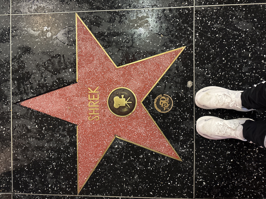A top-down shot showcases Shrek's Hollywood Walk of Fame star embedded in speckled black terrazzo