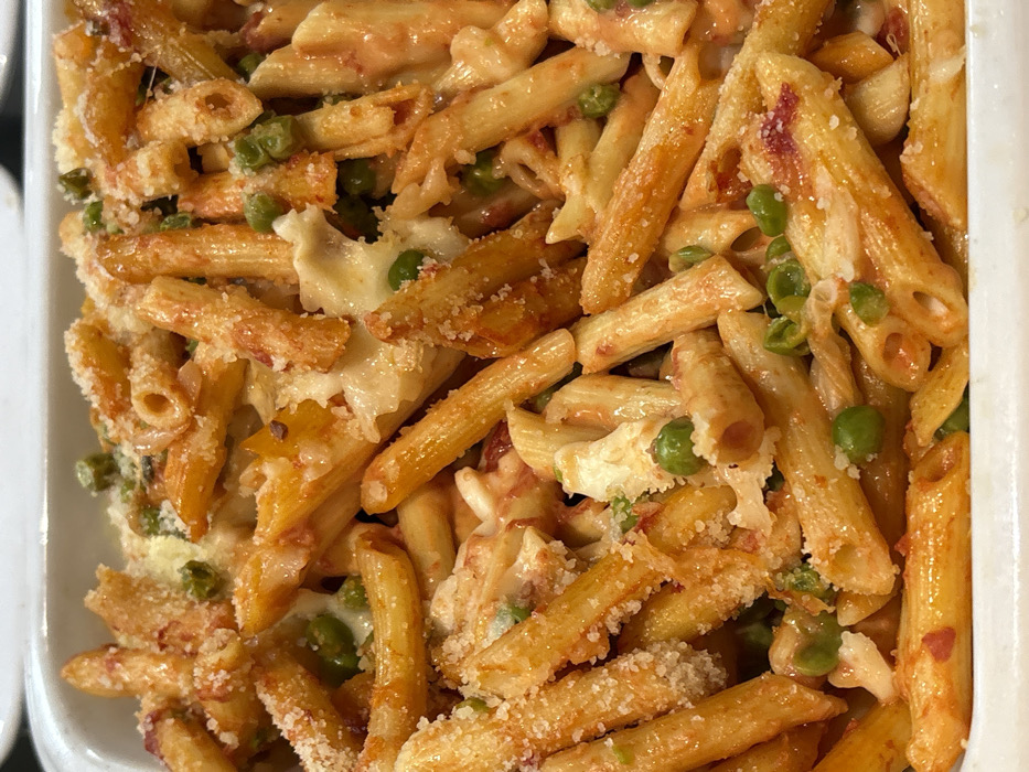 - "A close-up, top-down view reveals a prepared dish of penne pasta with a reddish-orange sauce, green peas, and white grated cheese, likely Parmesan, sprinkled over the top" by FM-E1hwL2, licensed under CC BY 4.0