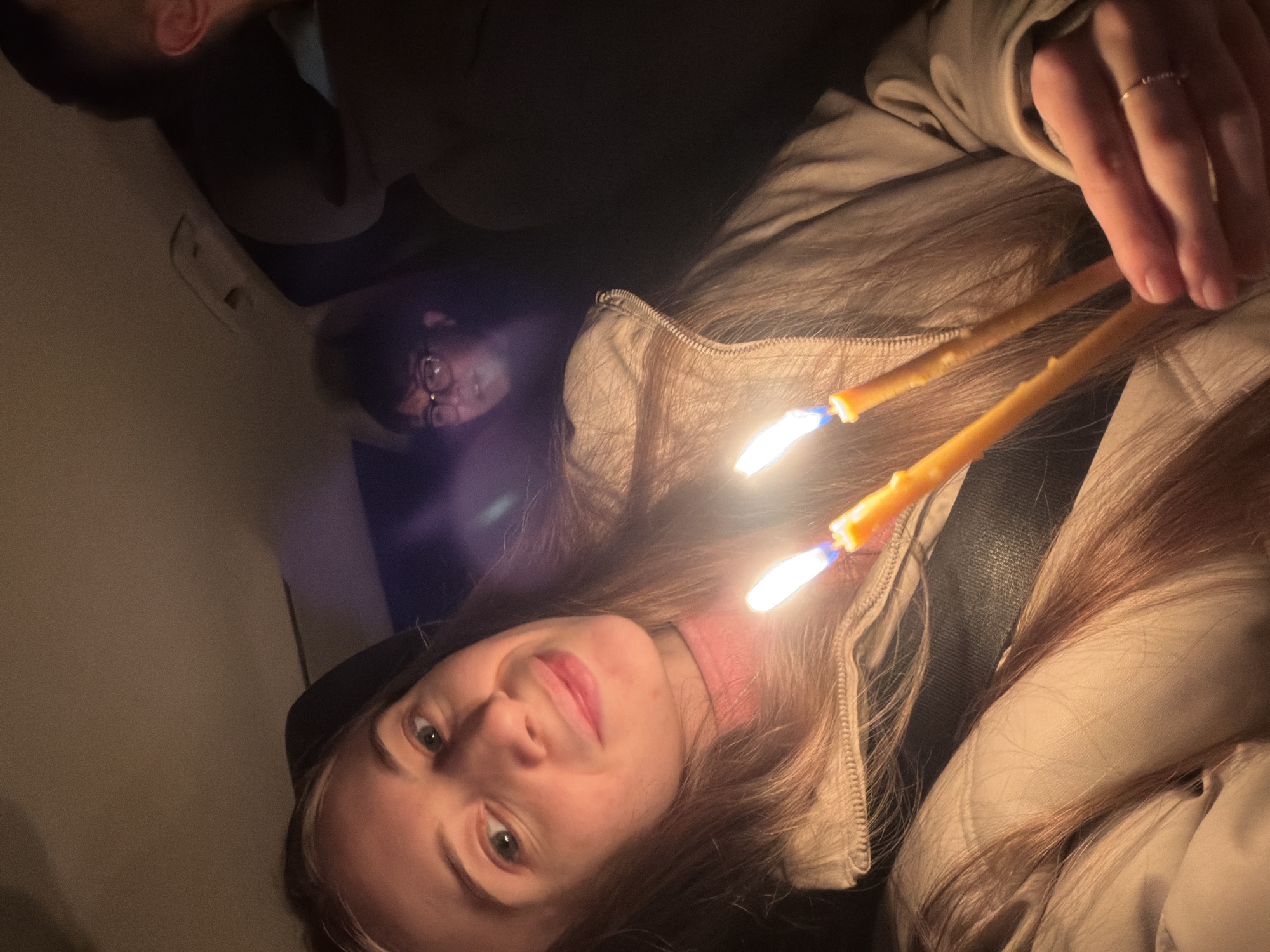 woman with light skin and long brown hair holding two lit candles. She is wearing a beige jacket and a black seatbelt is visible across her body. Her face is angled towards the camera, with a slight smile. In the background, another person wearing glasses peers into the frame. The setting appears to be inside a vehicle, given the presence of the seatbelt and car interior visible in the background. There is no direct evidence of the location being Milevo, Bulgaria, based on the image content.