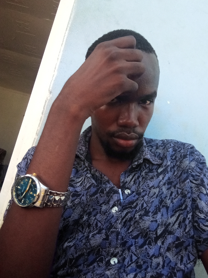 An adult male with a dark complexion, short dark hair, and a light beard poses for a portrait, directly facing the camera. He is situated indoors, against a plain light blue wall on the right and a white architectural element separating it from a light-colored, patterned ceiling on the left. The male wears a short-sleeved collared shirt with a dark blue and black abstract pattern and white buttons. A large wristwatch with a silver-toned band, gold-toned accents, and a dark blue/teal face is present on his left wrist. His left arm is bent, with his hand positioned near his forehead. The scene is located in a room within Makadara/Mji Wa Kale ward, Kenya.