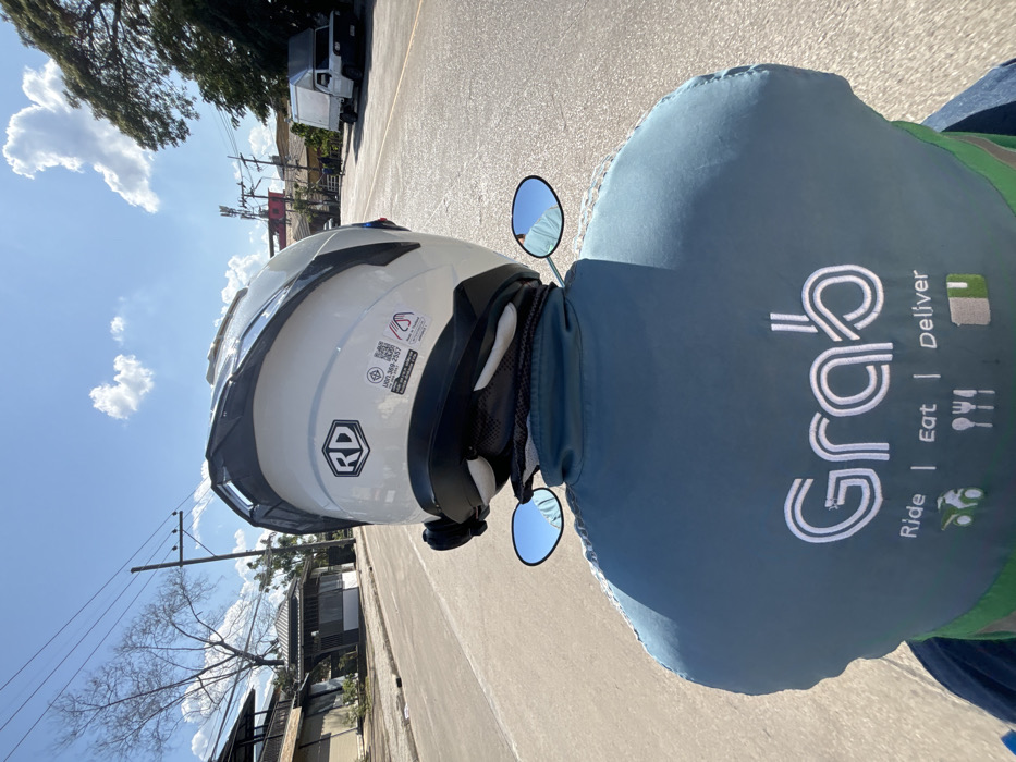 person wearing a white motorcycle helmet and a blue Grab delivery jacket