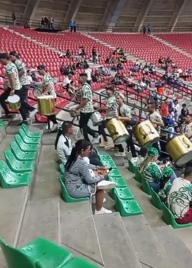 The video captures a scene inside a large stadium with predominantly red seating. In the foreground, a group of individuals are playing large drums, moving energetically through the rows of green seats. Some people are seated, watching the drummers or occupied with their phones. The drummers, mostly men, are wearing matching outfits, while the seated spectators are dressed in a variety of casual clothing. The stadium has a high, vaulted ceiling, and other spectators can be seen scattered throughout the stadium in the background.
