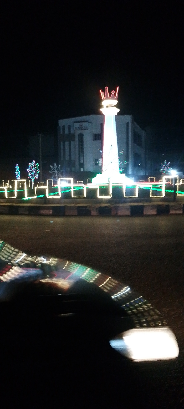 A night view captures a light-adorned traffic circle with a towering white structure topped by a red crown. A multi-story building with 'NASCO' visible on its facade stands as a backdrop. Additional decorative lights line the circle's perimeter and resemble small trees. The foreground is dark and blurred, likely the interior of a vehicle, with indistinct bright shapes.