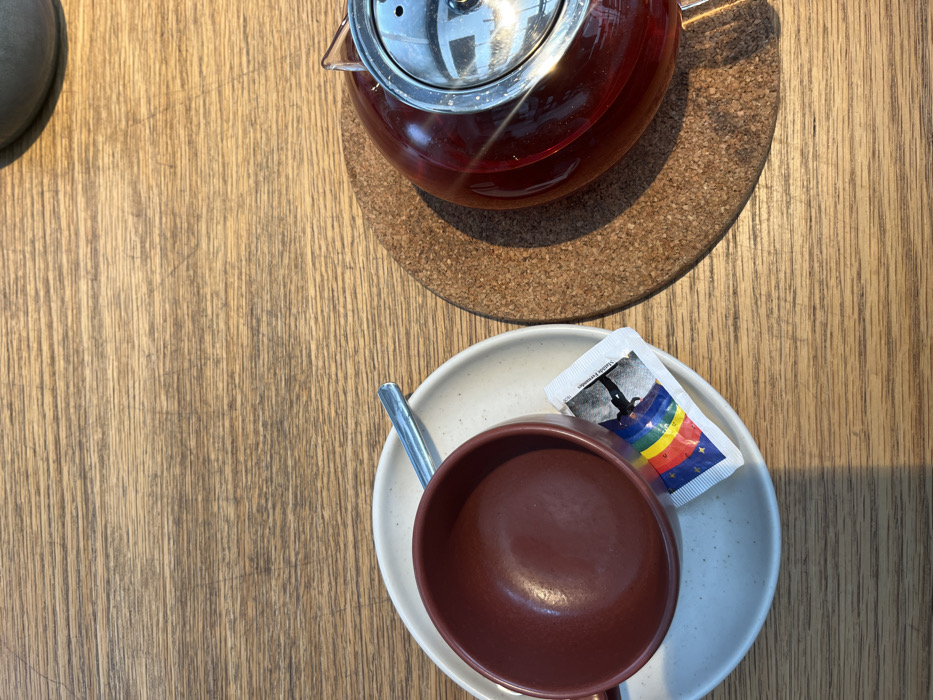 An overhead, static shot captures a wooden table surface within an establishment located in Lordelo do Ouro e Massarelos, Portugal. On the left side, a dark reddish-brown ceramic cup sits on a round, light-colored, speckled ceramic saucer. A silver spoon is positioned on the saucer, with its bowl resting inside the cup. Adjacent to the cup on the saucer is a small white packet, displaying a rainbow-striped pattern at its base and a dark silhouette graphic above it, with the text "Stevia Pormenores" partially visible. On the right side, a clear glass teapot, filled with a dark red liquid, rests on a circular cork coaster. The teapot is equipped with a reflective metallic lid. Strong, directional lighting casts distinct shadows from the cup and teapot onto the table surface. No individuals are present in the frame, and no direct actions or interactions are depicted, implying a static arrangement of items for beverage service.