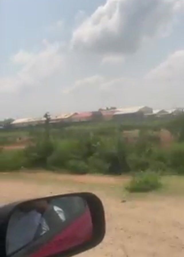 The video, taken from the inside of a car, shows a view from the passenger seat looking out the side window and forward. The car is driving on a dirt road, and the landscape features dry, grassy terrain with some green vegetation. In the distance, a row of buildings is visible under a partly cloudy sky. The car's side mirror is visible in the foreground, reflecting the interior of the car and a person wearing a white shirt. The camera is handheld, resulting in some movement as the car drives.