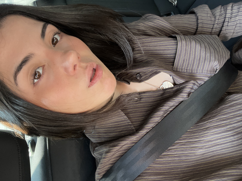 A woman with dark hair and brown eyes is wearing a brown striped shirt and a seatbelt. She's indoors, likely in a car. A silver necklace with a heart-shaped pendant is visible. Her makeup is natural, with a touch of blush. The lighting is soft and diffused, highlighting her features. The shot is taken at a slight angle, adding a casual feel.