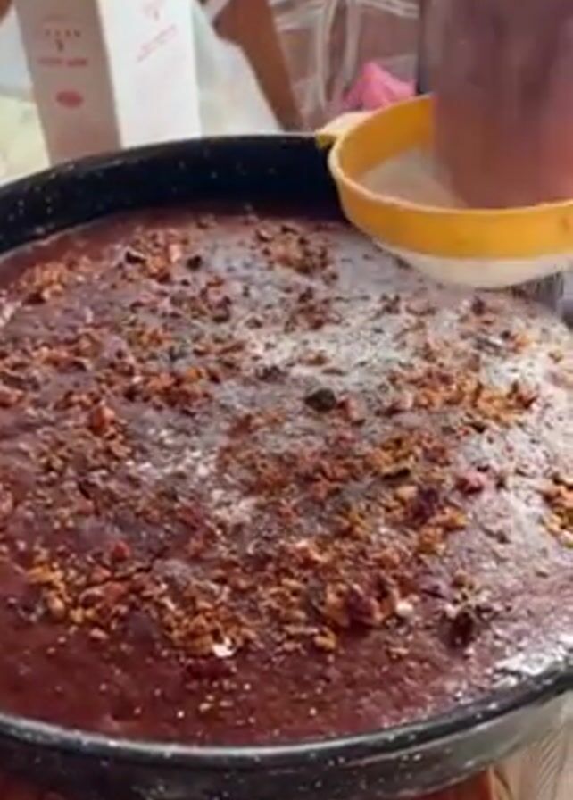 An overhead shot shows a person's hands sifting white powdered sugar over a circular cake in a black baking pan with a yellow sifter. The cake is a dark brown color, covered with chopped nuts. The person's hands are wrinkly and close to the sifter. A carton of powdered sugar is visible next to the pan. The cake is on a wooden countertop.