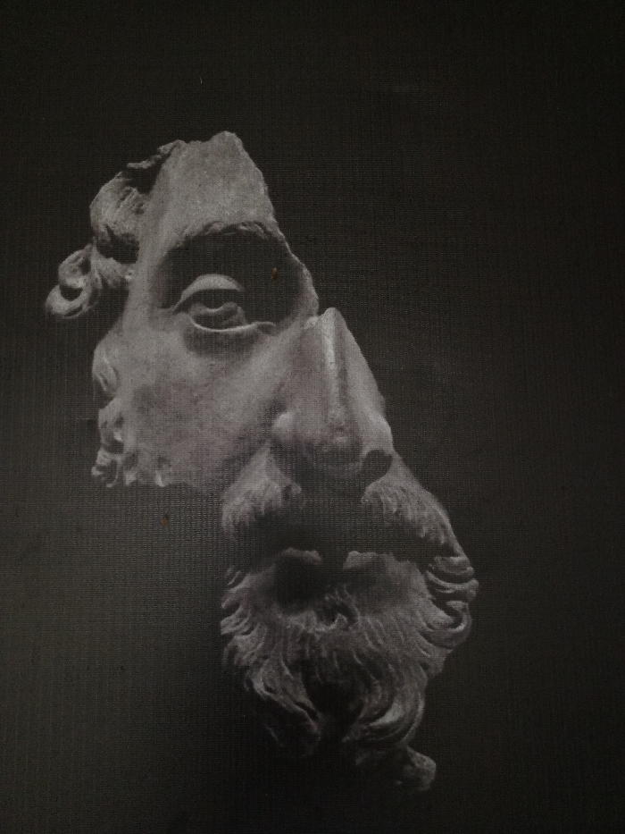 - "The image displays a fragmented, light-colored stone sculpture of a human head, rendered in grayscale against a uniformly dark, textured background" by FM-TLp3C2, licensed under CC BY 4.0
