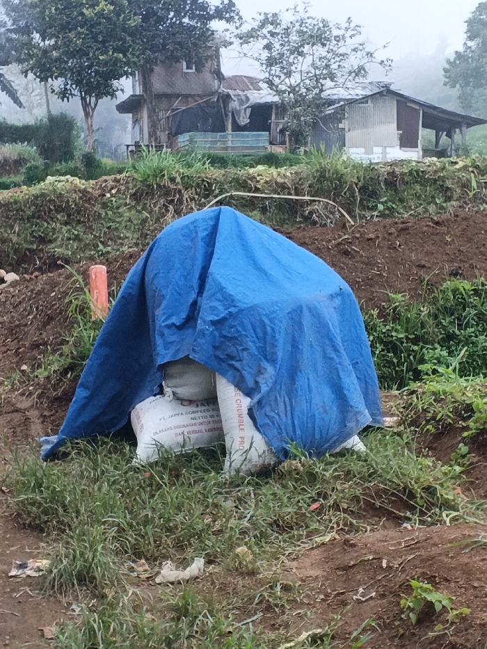 This image captures a scene in Pinnwe, Myanmar (Burma), under overcast and hazy atmospheric conditions. In the foreground, a blue tarp is draped over several white sacks resting on a mixture of brown earth and green grass. Exposed portions of the sacks reveal text, with one visibly marked "PT. JAPFA COMFEED B" and "NETTO 50 KG," and another indicating "SE CRUMBLE PRO." To the left of the covered sacks, a short, reddish-orange pipe section protrudes from the ground. The immediate ground cover includes scattered grass, bare soil, and minor debris. The midground presents a sloped terrain of disturbed brown earth and green vegetation, with a white, horizontal pipe-like structure traversing it. In the background, situated on a higher elevation and partially obscured by dense green trees and mist, are two weathered residential structures. The structure on the left is multi-story with a visible window on its upper floor, while the structure on the right features corrugated metal siding and a lean-to roof extension. No individuals are present in the scene.