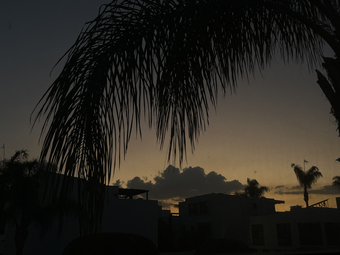 - "Silhouetted palm fronds dominate the foreground, framing a view of buildings at dusk" by FM-v8bHp1, licensed under CC BY 4.0