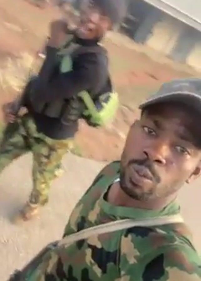 Two individuals, possibly soldiers or security personnel, are recording a selfie video outdoors