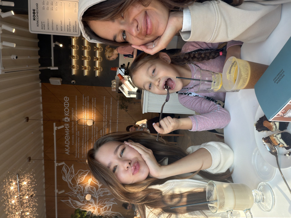 A photo in a cafe shows two girls posing, one an older teen and the other a child eating dessert