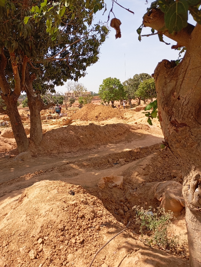 The scene depicts an active excavation and construction site in Rayfield, Nigeria, under clear daylight conditions. The ground is primarily reddish-brown earth, characterized by numerous irregular piles of excavated soil and dug trenches throughout the midground. Large, mature trees with green foliage frame the foreground, with thick trunks visible on the left and right, partially obscuring the view. In the midground, approximately a dozen individuals are observed engaged in construction-related activities, including handling stacks of light-colored building blocks or bricks on the left side. Further in the background, a cluster of multi-story buildings, possibly under construction, stands on a higher elevation, beneath a prominent tall, thin mast or antenna silhouetted against a light blue sky. A dark, flexible cable is present on the ground in the immediate foreground, extending from the lower right. Sparse green vegetation grows in small patches, notably near the cable and along the excavated earth.