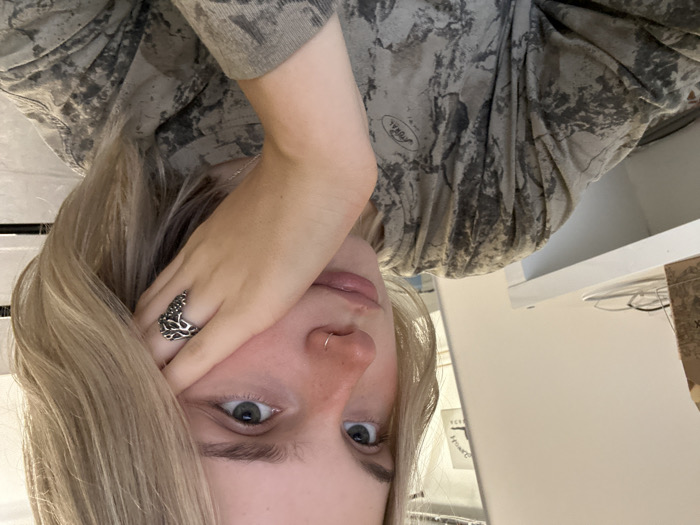 A person with blonde hair and fair skin is pictured from an upside-down perspective. They are wearing a camouflage shirt. The person’s right hand is raised, partially obscuring their face and revealing a distinctive silver ring with a floral or organic design. A silver nose ring is visible on the left side of their nose. Their blue eyes are wide and looking directly at the camera. The background shows a white wall and a glimpse of a desk with papers and glasses.