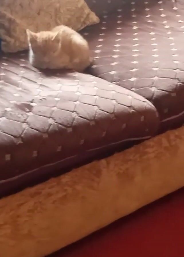 A still, eye-level shot shows a small, tan cat loafing on the edge of a brown quilted sofa